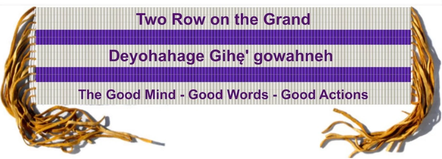 Two Row on the Grand commemorates the Two Row Wampum Treaty of 1613, between the Haudenosaunee and Dutch colonists, which was the original peace treaty between indigenous and settler communities. In 2013, the 400th anniversary of the treaty was commemorated by the Two Row Wampum Renewal Campaign Paddle from Albany to Manhattan, along the Hudson River in New York. Ellie Joseph and Jay Bailey participated in this event and in 2016, they founded Two Row on the Grand. Each year, a group of Indigenous and non-Indigenous people paddle the Grand River on a 10-day adventure, camping and eating together, and sharing traditional teachings, dancing, storytelling and sharing circles. If you are interested in participating, click on the link above.